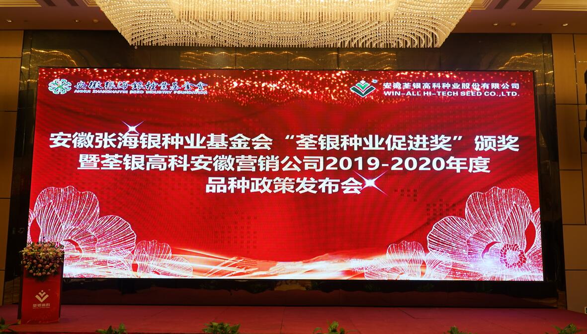 ??? 深耕種業,不忘初心。8月19-20日,安徽張海銀種業基金會2019年“荃銀種業促進獎”頒獎大會暨荃銀高科安徽營銷公司品種政策發布會在安徽蕪湖隆重召開。安徽省種子管理總站副站長劉根、中國貿促會蕪湖市支會會長常拯、蕪湖市種子管理站副站長陳煒平、安徽荃銀高科種業股份有限公司副董事長兼總經理張琴、常務副總經理兼營銷總監王玉林、安徽張海銀種業基金會秘書長張彤、建設銀行、益海嘉里等單位相關領導及安徽、江蘇、河南等省近200位種業精英們參會。