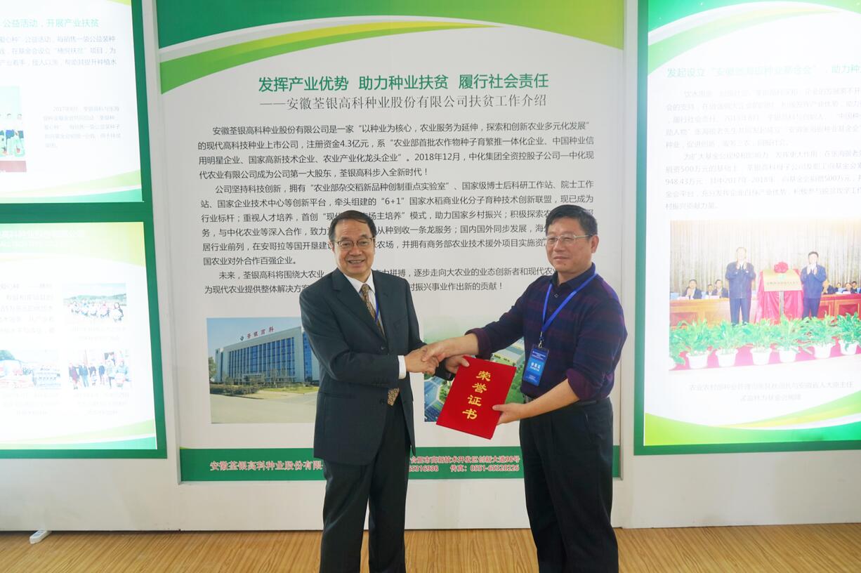 ??? 打好脫貧攻堅(jiān)戰(zhàn)是黨的十九大提出的三大攻堅(jiān)戰(zhàn)之一,對(duì)如期全面建成小康社會(huì)、實(shí)現(xiàn)我們黨第一個(gè)百年奮斗目標(biāo)具有十分重要的意義。習(xí)近平總書(shū)記多次強(qiáng)調(diào),要?jiǎng)訂T全社會(huì)力量廣泛參與扶貧事業(yè),鼓勵(lì)支持各類(lèi)企業(yè)、社會(huì)組織、個(gè)人參與脫貧攻堅(jiān)。荃銀高科自成立以來(lái),堅(jiān)持以發(fā)展民族種業(yè)為己任,在做強(qiáng)做大企業(yè)的同時(shí),積極發(fā)揮產(chǎn)業(yè)優(yōu)勢(shì),助力種業(yè)扶貧,履行社會(huì)責(zé)任,取得積極成效。為表彰荃銀高科在扶貧工作中的突出表現(xiàn),中國(guó)種子協(xié)會(huì)為公司頒發(fā)榮譽(yù)證書(shū)。